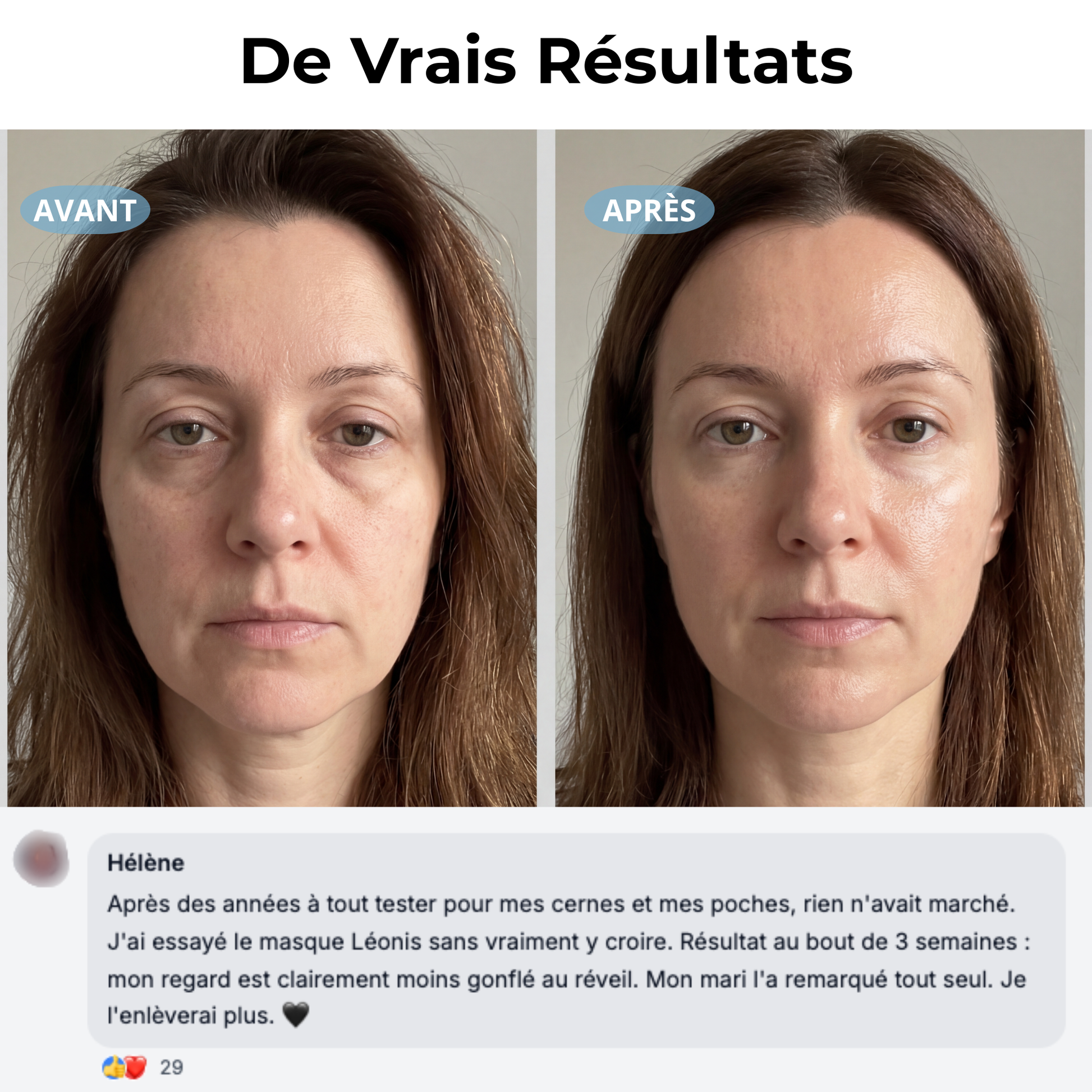 - Atténue visiblement cernes et poches sous les yeux.